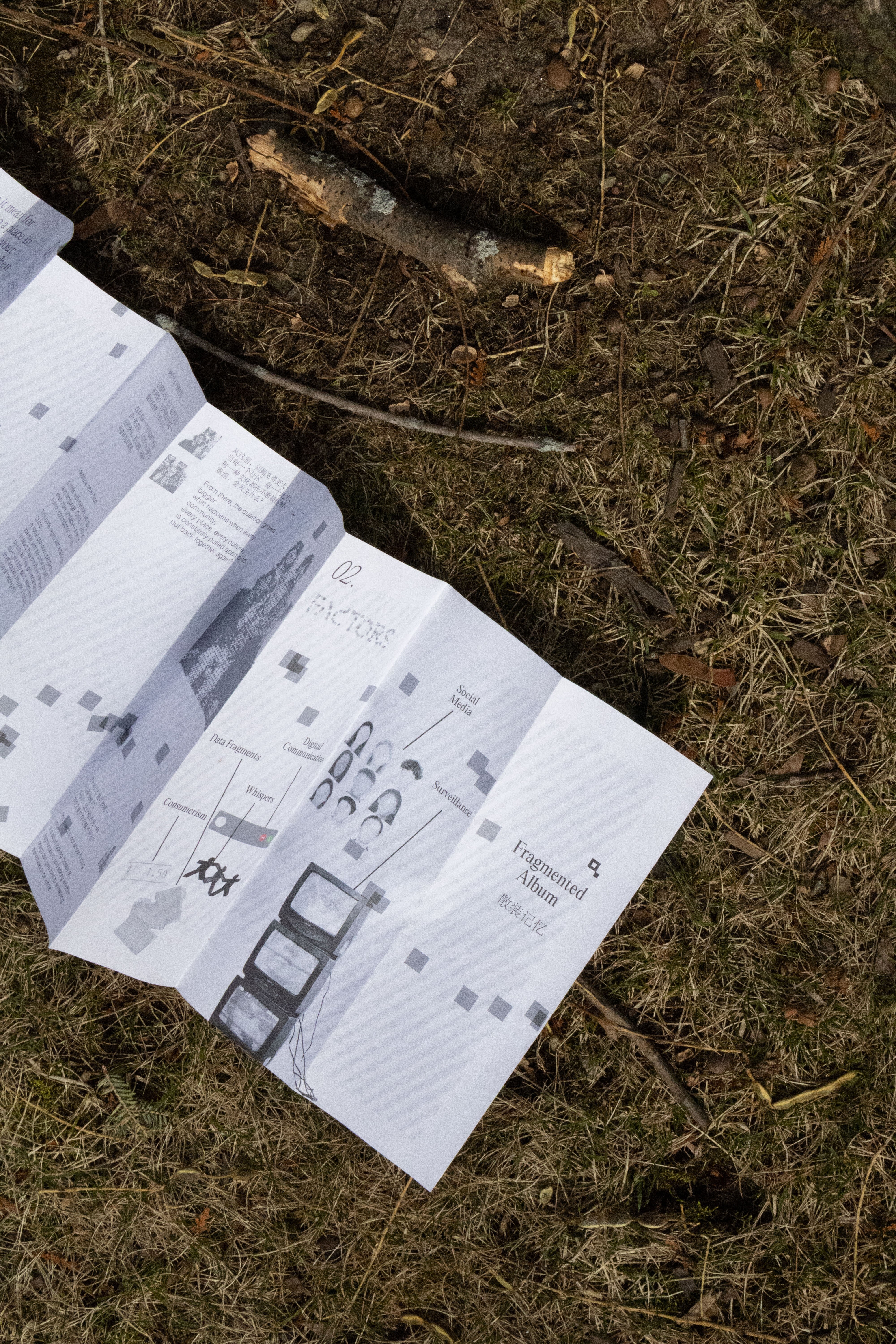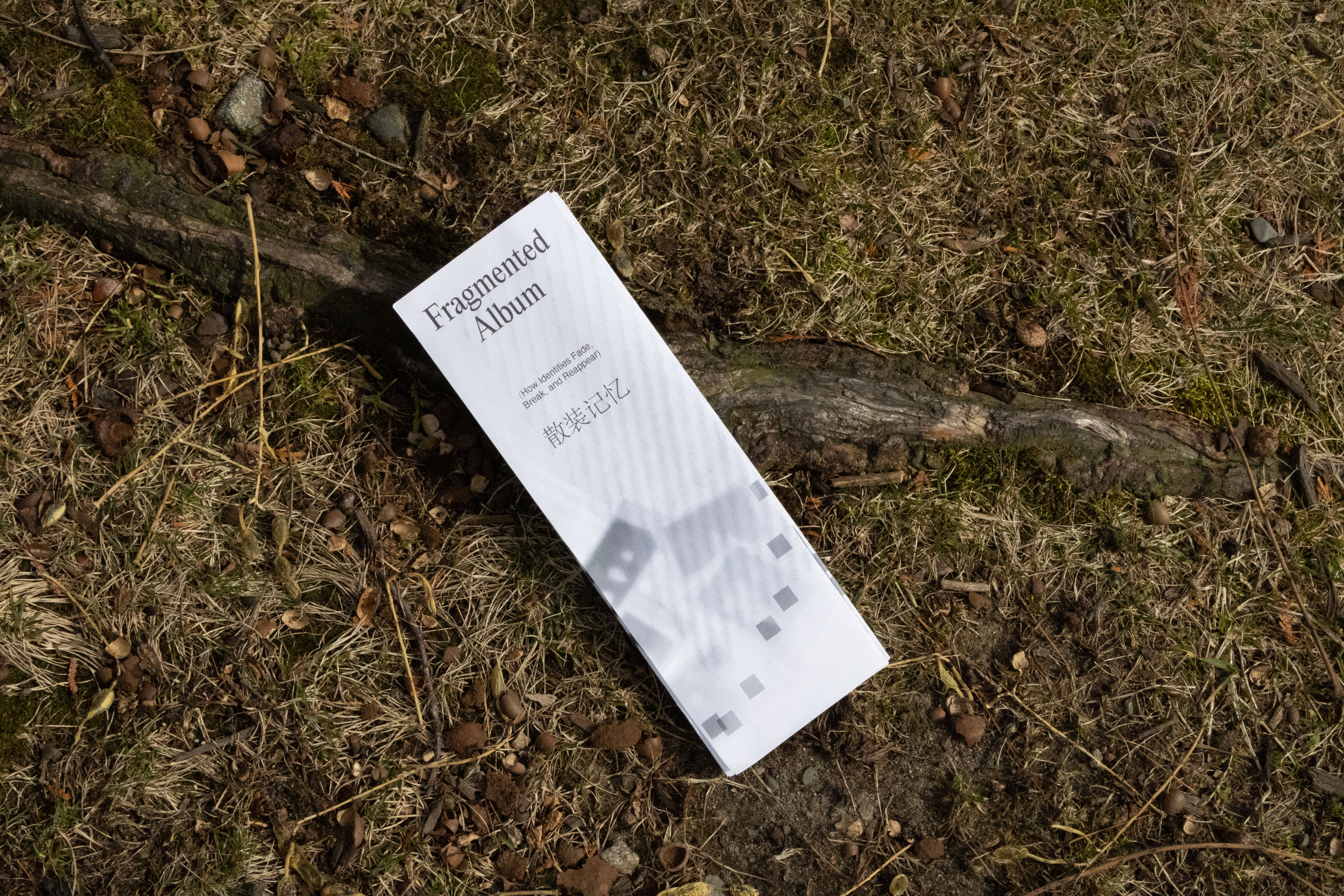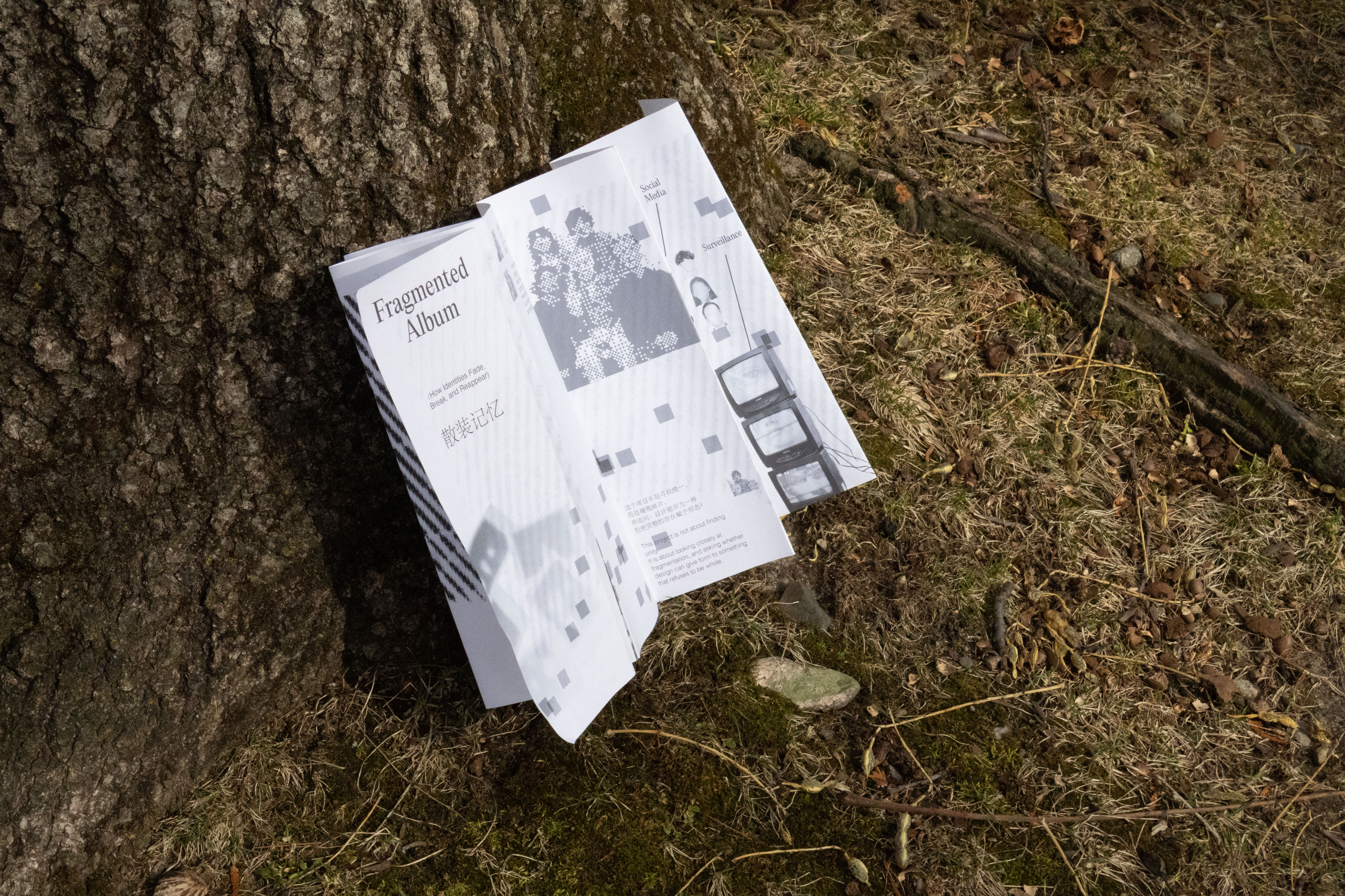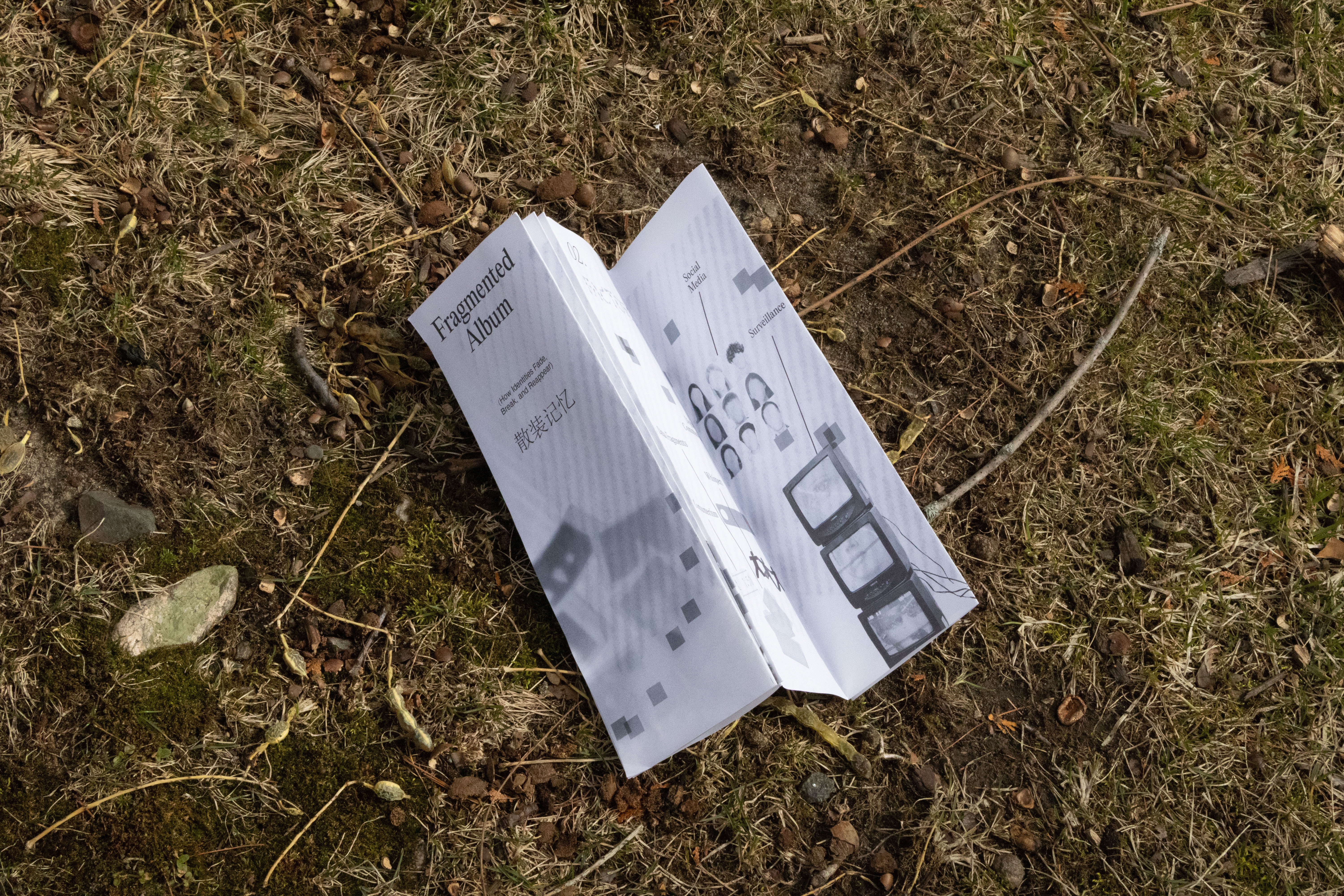 This zine was the first work I made after deciding to explore fragmented identity as the core of my thesis. It collects small everyday moments in which identity shifts, hides, or breaks apart, becoming the starting point and emotional foundation of the whole project. Designed in an 8 × 30 inch format, the publication uses a long horizontal structure and flowing square elements to connect text and images. This visual language also draws from Suzhou, my hometown, especially its canals, bridges, and sense of movement.